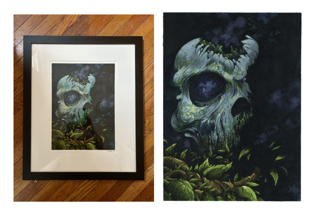 Emerald Eclipse, created in 2009 for my solo show The Hidden Dimension at Fuse Gallery in NYC. The art was also licensed to the band Gates of Slumber for their album The Wretch by Rise Above Records. It measures 10.5″ x 14.5″ with the framed dimensions at 20″ x 24.5″
